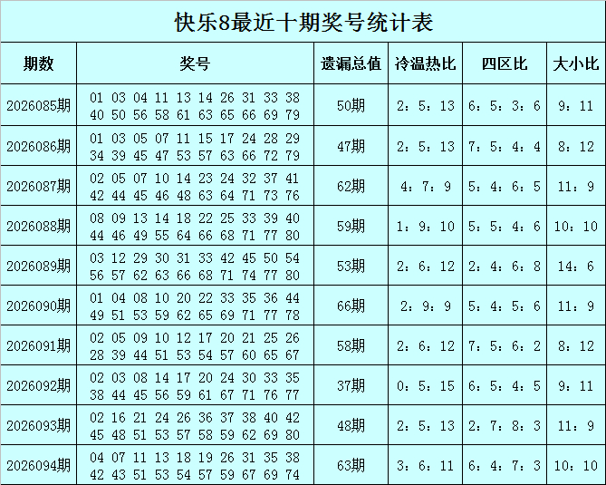 福彩快乐8第2026094期开奖回顾:04 07 11 13 18 19 26 31 35 38 42 43 51 53 54 57 59 67 69 74,其中奖号遗漏总值为63,冷温热码比为3:6:11,四区比为6:4:7:3。
